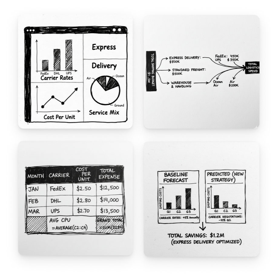 I designed a net-new feature for calculating and forecasting shipping expenses. This solution revolves around a driver tree structure with nodes, parents, and children to visually represent the hierarchy and interdependencies of our expenses. This was the design move that transformed static data into an interactive financial model.